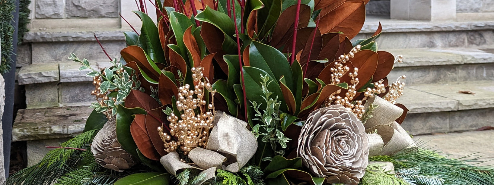 This Winter Urn Planter is composed of fresh pine, cedar, silver fur, and lovingly adorned with ribbon, rustic flower decor, coloured berries, large pine cone, magnolia leaves, thick birch branches and dogwood - perfect for sparkling your home with graceful decor. Give your home a bit of festive charm with this winter masterpiece.